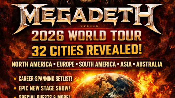 Thrash metal legends Megadeth have officially announced a massive 2026 World Tour, sending waves of excitement through the global metal community. The iconic band confirmed that the tour will span 32 cities across multiple continents, marking one of their most ambitious international runs in recent years.